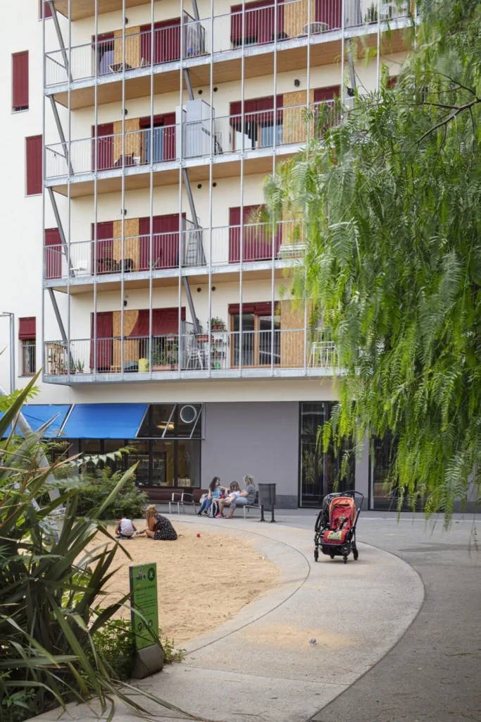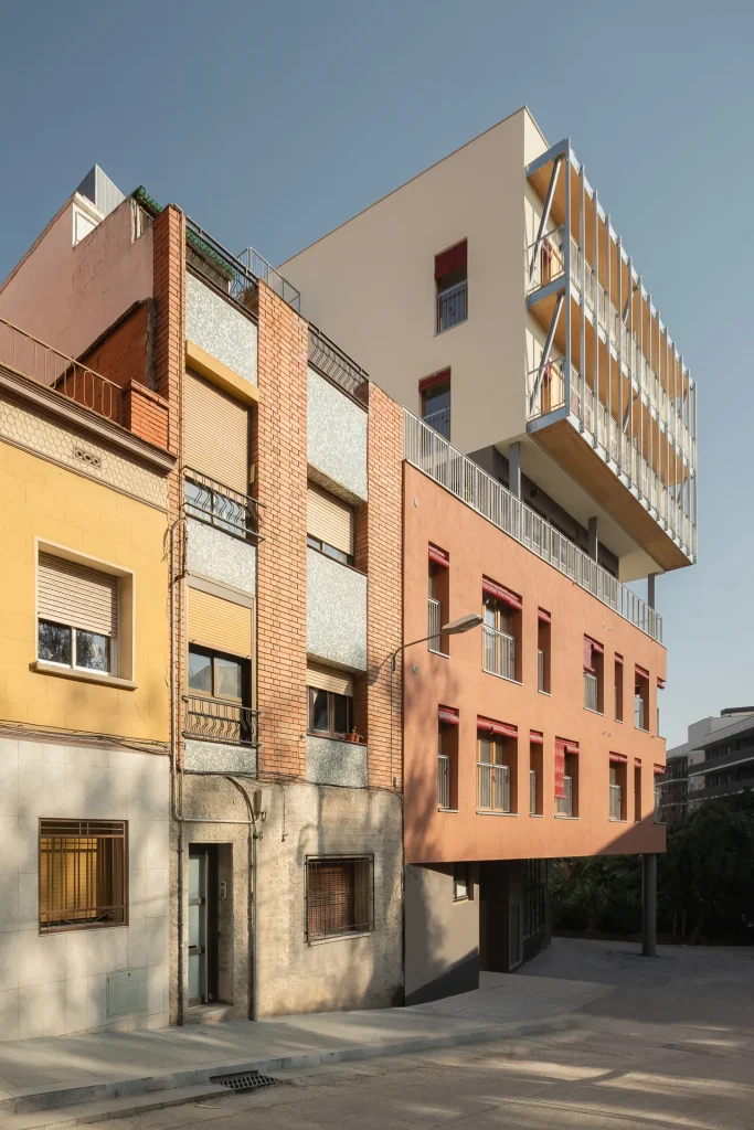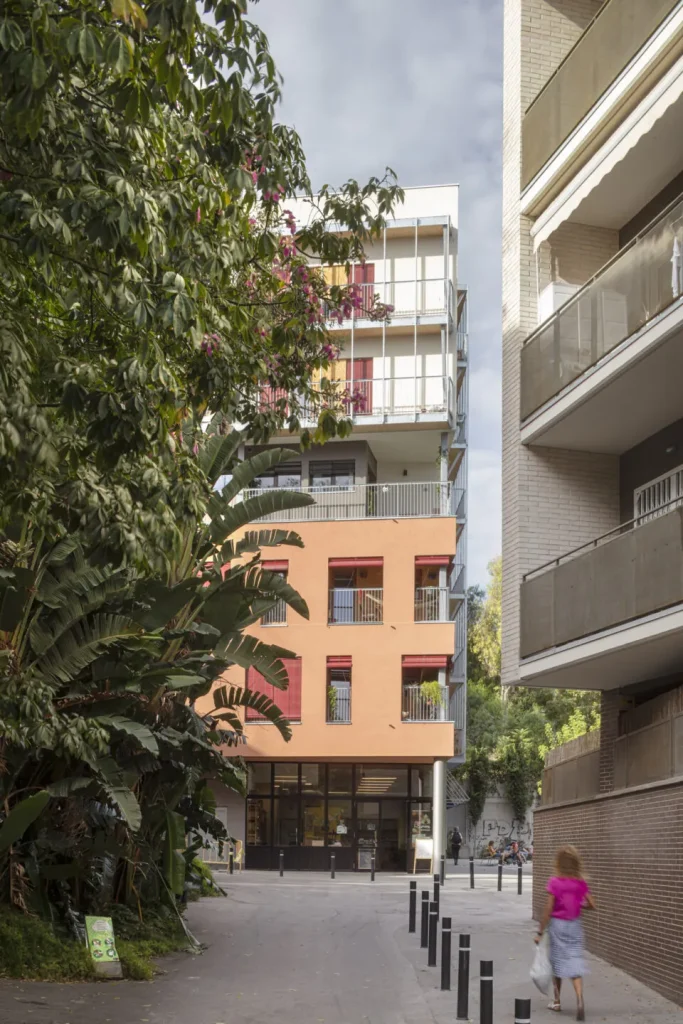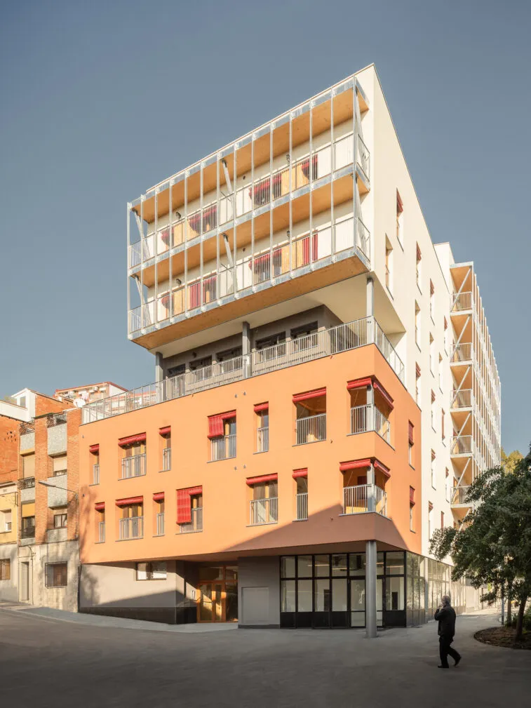 En medio del barrio popular de Roquetes de Barcelona, en un solar municipal que hace esquina entre la calle Plana dels Cirerers y la Plaça de les Dones de Nou Barris, se levanta el edificio Cirerers, otra forma de hacer vivienda a través de tres conceptos: hacer ciudad, ser comunidad y generar balance positivo.