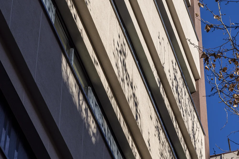 Rehabilitación integral de la fachada, aislamiento SATE en los cerramientos verticales con sistema de aislamiento térmico exterior por fachadas tipo Traditerm de GRUPO PUMA de acuerdo con la EOTA (European Organisation for Technical Aprovals) Aprobación Técnica Europera ETA-03/002 y con nuevos aplacados de piedra natural siguiendo la geometría original del edificio. El Hotel Majestic se encuentra entre las calles Camp Elisis y Valencia.